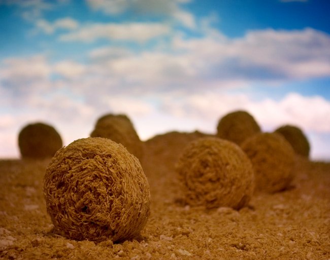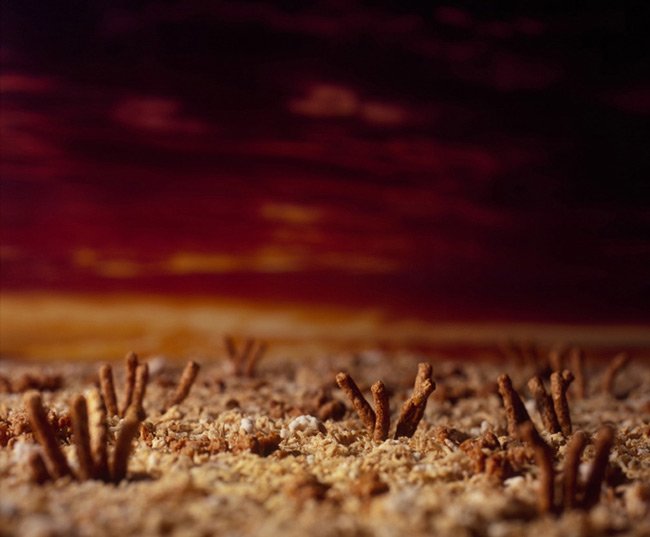 Some of the cereal that is made up of mostly bran or fiber has the color and texture of the desert, so it’s an easy leap from there to a desert tableau. I used enlarged photographic prints of actual Arizona skies as backdrops to add that surreal quality that lends reality to the images.